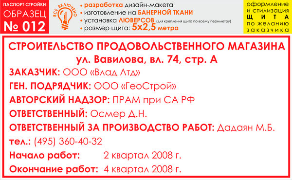 Паспорт стройки, образец № 12 (баннерная ткань, 5000х2500 cм) в Великом Новгороде купить