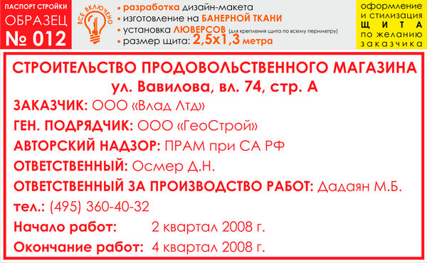 Паспорт стройки, образец № 12 (баннерная ткань, 2500х1300 cм) в Великом Новгороде купить