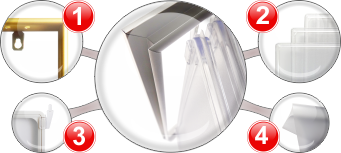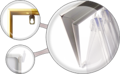 Дополнительно: штырьки для фиксации рамок в основании перекидной системы, а также специальные прорези для быстрого размещения и замены вложенной печатной продукции |