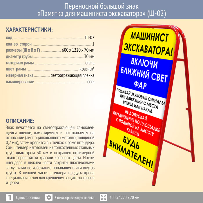 Переносной большой знак «Памятка для машиниста экскаватора» (Ш-02, односторонний, светоотражающая пленка) в Великом Новгороде купить