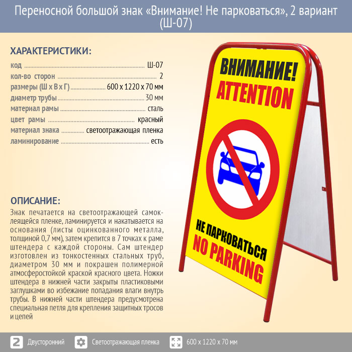 Переносной большой знак «Внимание! Не парковаться», 2 вариант (Ш-07, двусторонний, светоотражающая пленка) в Великом Новгороде купить