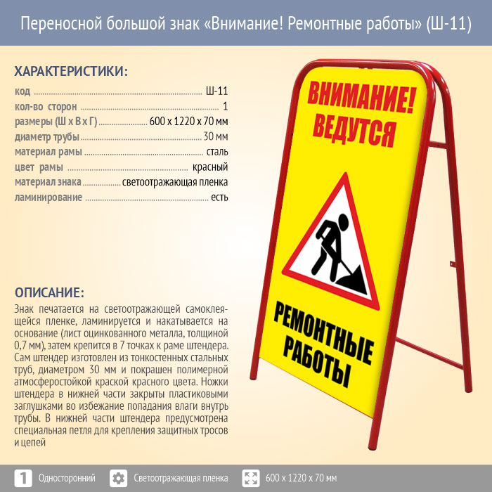 Переносной большой знак «Внимание! Ремонтные работы» (Ш-11, односторонний, светоотражающая пленка) в Великом Новгороде купить