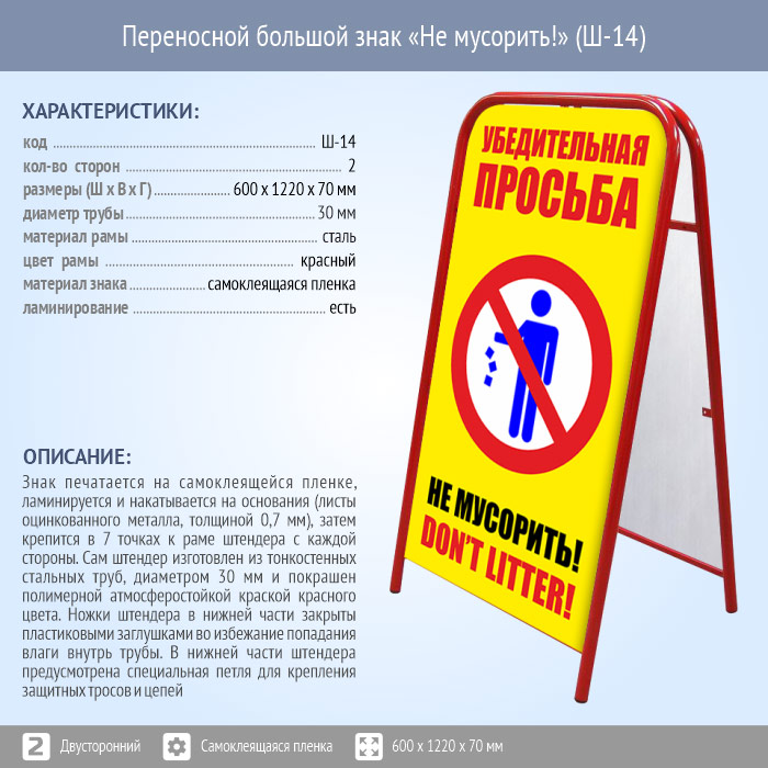 Переносной большой знак «Не мусорить!» (Ш-14, двусторонний, самоклеящаяся пленка) в Великом Новгороде купить