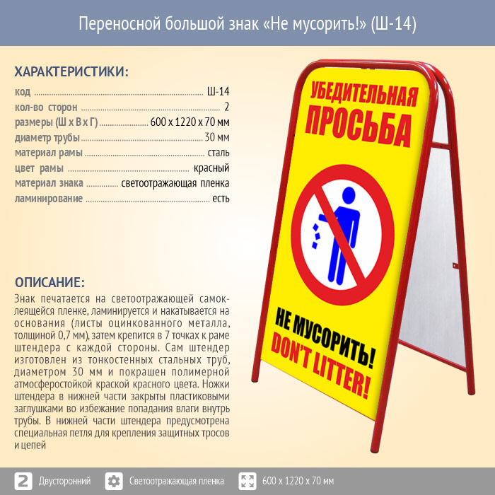 Переносной большой знак «Не мусорить!» (Ш-14, двусторонний, светоотражающая пленка) в Великом Новгороде купить