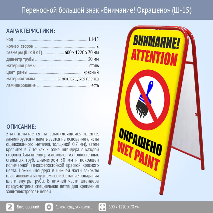 Переносной большой знак «Внимание! Окрашено» (Ш-15, двусторонний, самоклеящаяся пленка) в Великом Новгороде купить