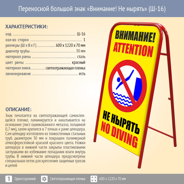 Переносной большой знак «Внимание! Не нырять» (Ш-16, односторонний, светоотражающая пленка) в Великом Новгороде купить