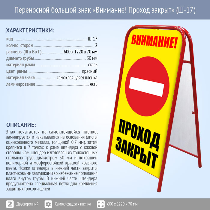 Переносной большой знак «Внимание! Проход закрыт» (Ш-17, двусторонний, самоклеящаяся пленка) в Великом Новгороде купить
