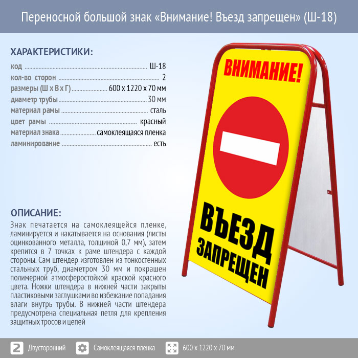 Переносной большой знак «Внимание! Въезд запрещен» (Ш-18, двусторонний, самоклеящаяся пленка) в Великом Новгороде купить