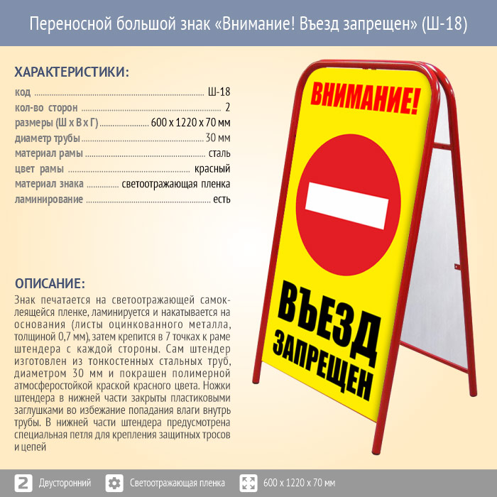 Переносной большой знак «Внимание! Въезд запрещен» (Ш-18, двусторонний, светоотражающая пленка) в Великом Новгороде купить