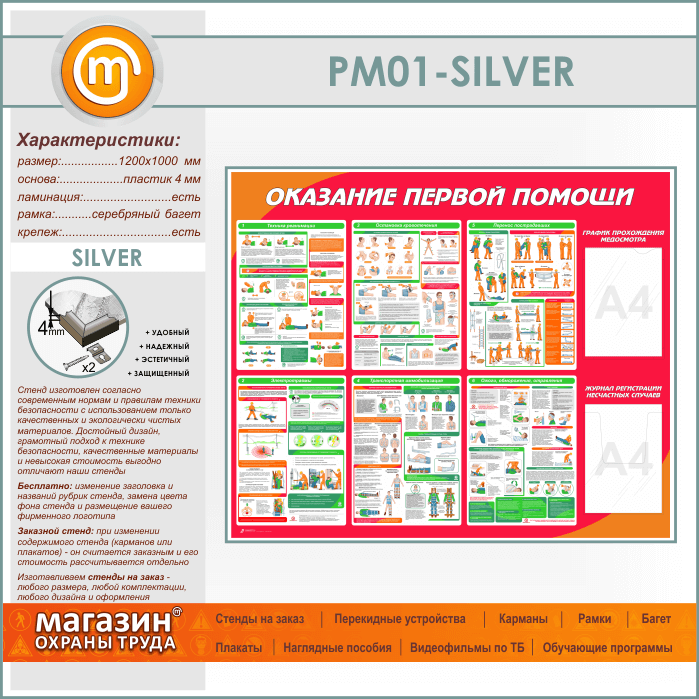 Стенд «Оказание первой помощи» с плоским и объемным карманами (PM-01-SILVER) в Великом Новгороде купить