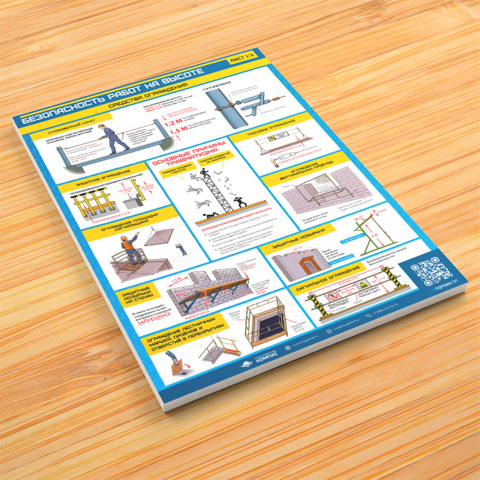 - Плакат «Средства ограждения»: страховочный канат и тросовое ограждение, защитное ограждение и ограждение вертикальных проемов, защитные козырьки на стенах и сигнальные ограждения