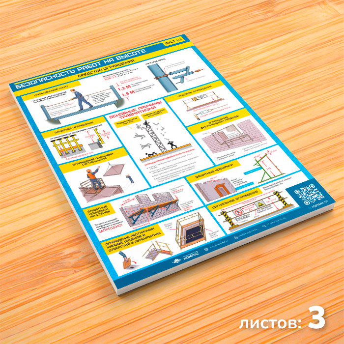 Комплект плакатов из 3-х листов «Безопасность работ на высоте» призван напомнить рабочим о технике безопасности при проведении высотных работ. Изложенная в них информация соответствует Правилам по охране труда на высоте, утвержденным Приказом Минтруда РФ от 28.03.2014 №155Н