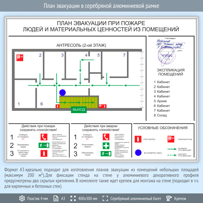 План эвакуации в серебряной алюминиевой рамке (А3 формат) в Великом Новгороде купить