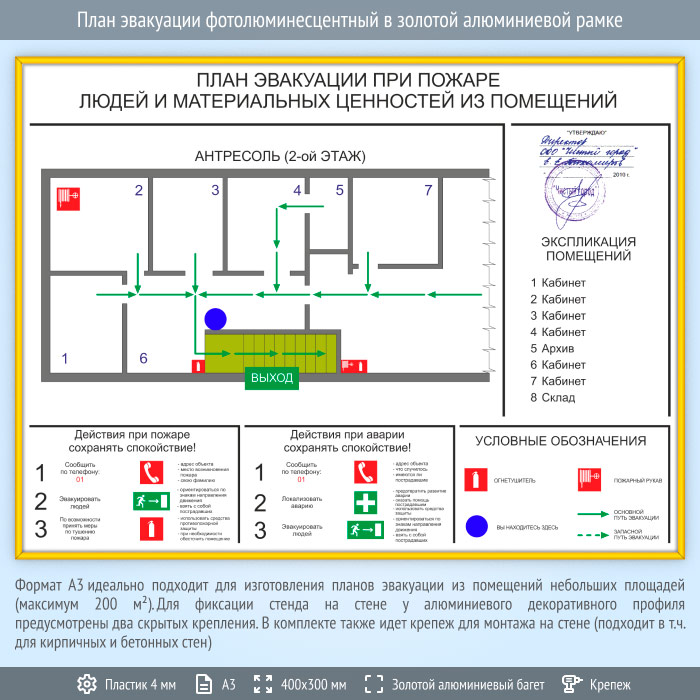 План эвакуации в золотой алюминиевой рамке (А3 формат) в Великом Новгороде купить