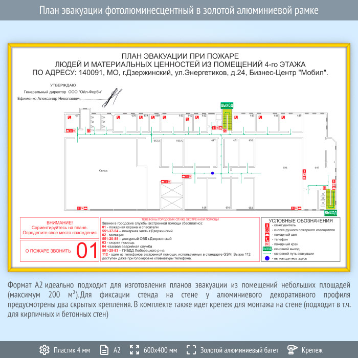 План эвакуации в золотой алюминиевой рамке (А2 формат) в Великом Новгороде купить