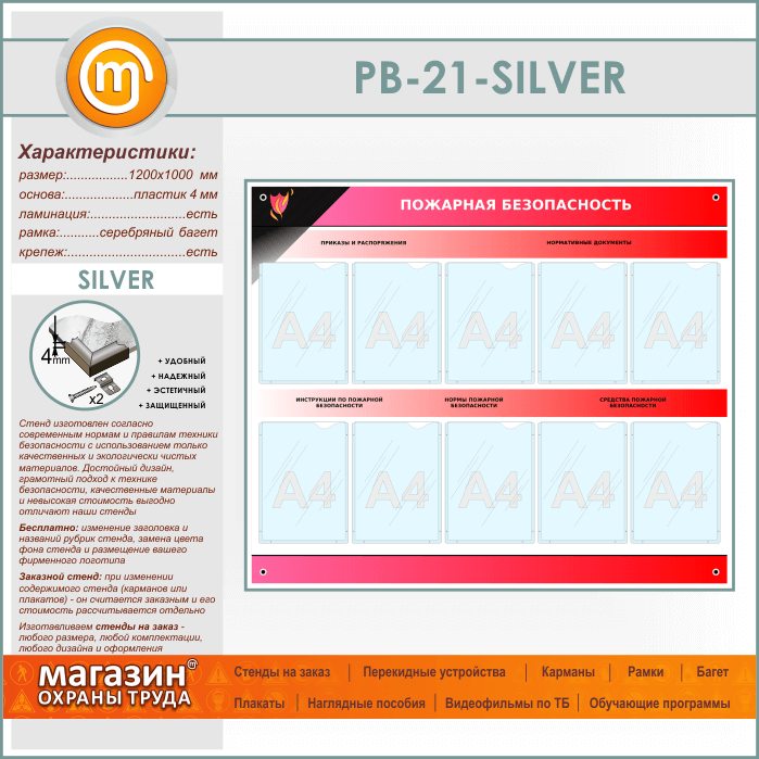 Стенд «Пожарная безопасность» с 10 карманами (PB-21-SILVER) в Великом Новгороде купить