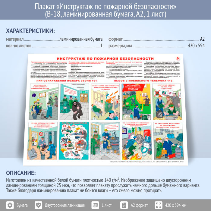 Плакат «Инструктаж по пожарной безопасности» (В-18, ламинированная бумага, А2, 1 лист) в Великом Новгороде купить