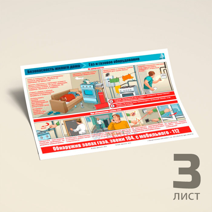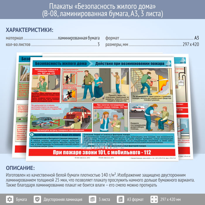 Плакаты «Безопасность жилого дома» (пожарная безопасность, газ и газовое оборудование, действия при возникновении пожара) (В-08, ламинированная бумага, А3, 3 листа) в Великом Новгороде купить