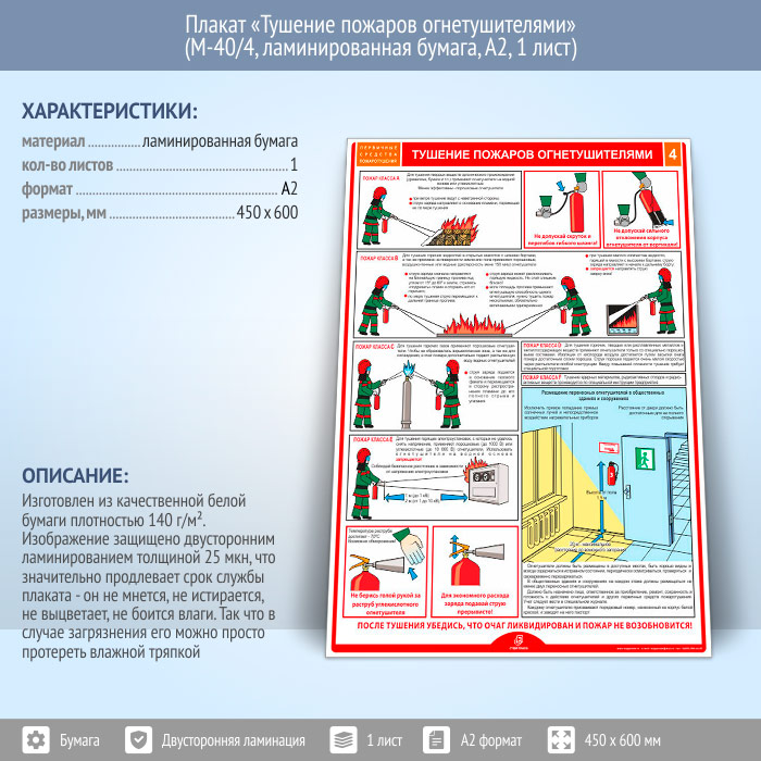 Плакат «Тушение пожаров огнетушителями» (М-40/4, ламинированная бумага, А2, 1 лист) в Великом Новгороде купить