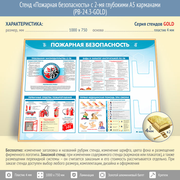 Стенд «Пожарная безопасность» с 2-мя глубокими А5 карманами (PB-24.3-GOLD) в Великом Новгороде купить