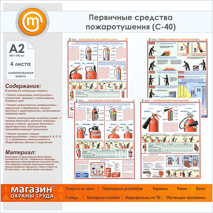 Плакаты «Первичные средства пожаротушения» (С-40, ламинированная бумага, А2, 4 листа) в Великом Новгороде купить