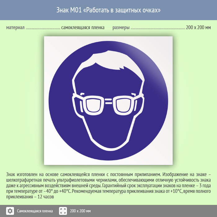 Знак M01 «Работать в защитных очках» (пленка, 200х200 мм) в Великом Новгороде купить