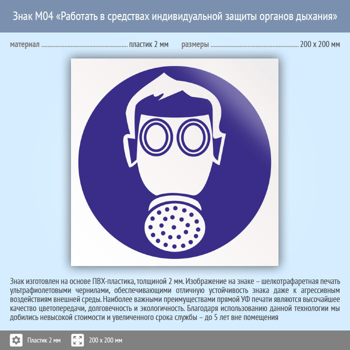 Знак M04 «Работать в средствах индивидуальной защиты органов дыхания» (пластик, 200х200 мм) в Великом Новгороде купить