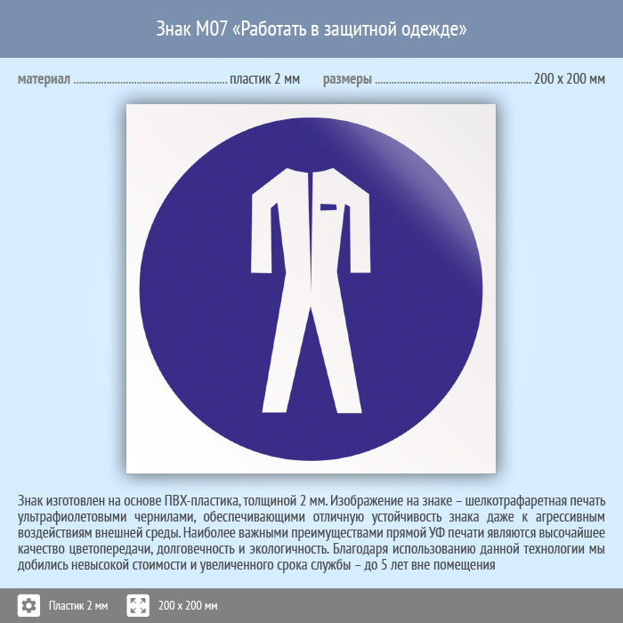 Знак M07 «Работать в защитной одежде» (пластик, 200х200 мм) в Великом Новгороде купить