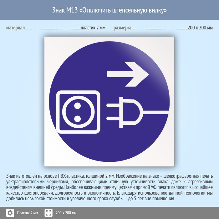 Знак M13 «Отключить штепсельную вилку» (пластик, 200х200 мм) в Великом Новгороде купить