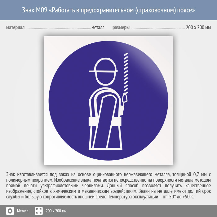 Знак M09 «Работать в предохранительном (страховочном) поясе» (металл, 200х200 мм) в Великом Новгороде купить