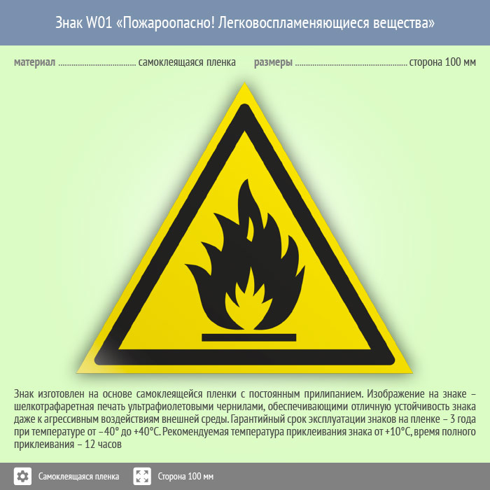 Знак W01 «Пожароопасно! легковоспламеняющиеся вещества» (пленка, сторона 100 мм) в Великом Новгороде купить