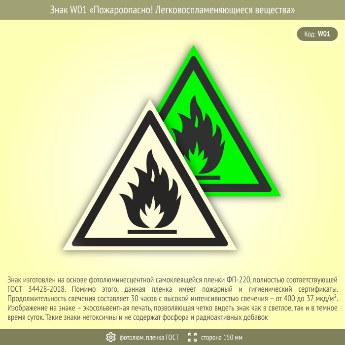 Знак W01 «Пожароопасно! легковоспламеняющиеся вещества» (фотолюминесцентная пленка ГОСТ 34428-2018, сторона 150 мм) в Великом Новгороде купить