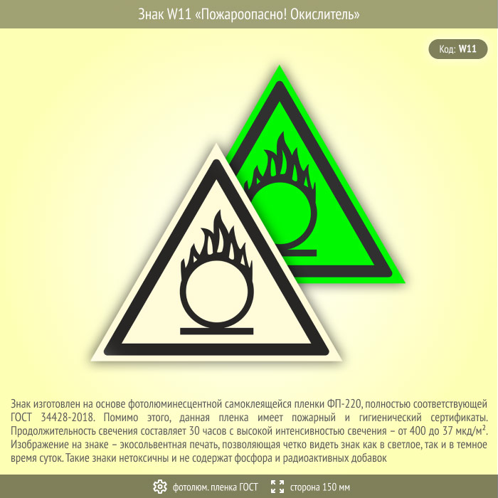 Знак W11 «Пожароопасно! окислитель» (фотолюминесцентная пленка ГОСТ 34428-2018, сторона 150 мм) в Великом Новгороде купить
