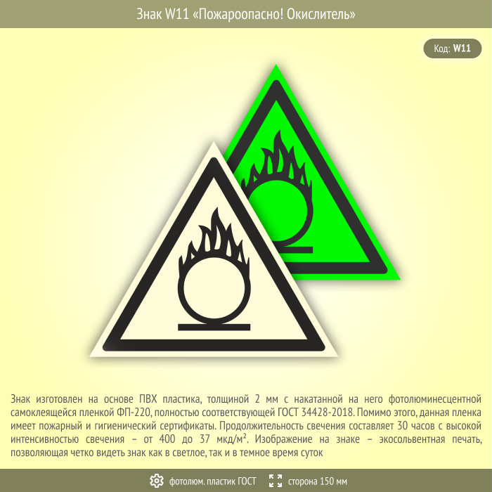 Знак W11 «Пожароопасно! Окислитель» (фотолюминесцентный пластик ГОСТ 34428-2018, сторона 150 мм) в Великом Новгороде купить