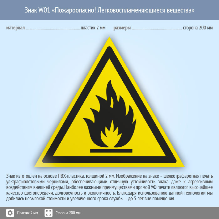 Знак W01 «Пожароопасно! легковоспламеняющиеся вещества» (пластик, сторона 200 мм) в Великом Новгороде купить