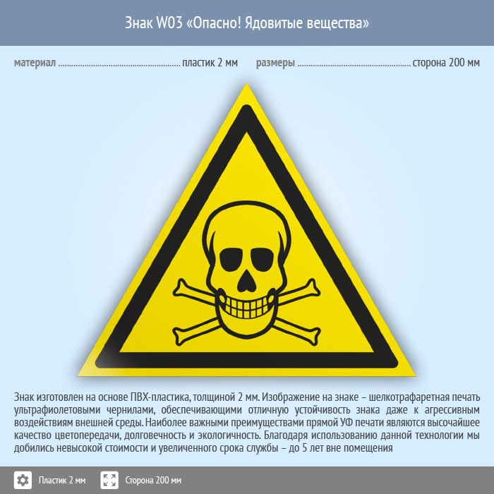 Знак W03 «Опасно! ядовитые вещества» (пластик, сторона 200 мм) в Великом Новгороде купить