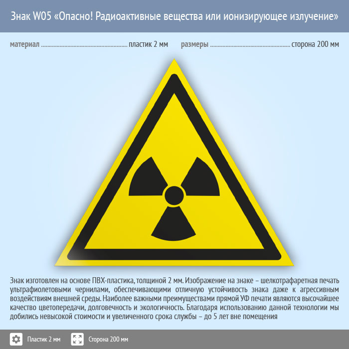 Знак W05 «Опасно! радиоактивные вещества или ионизирующее излучение» (пластик, сторона 200 мм) в Великом Новгороде купить