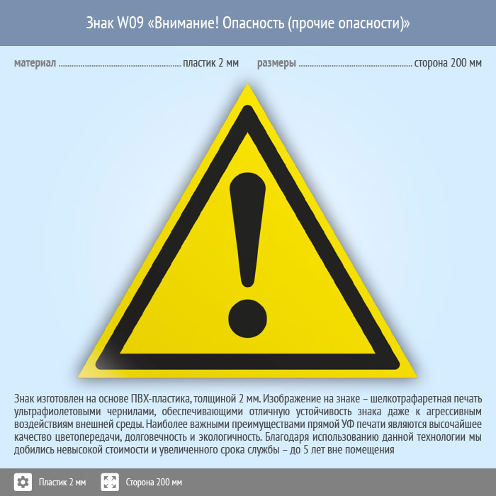 Знак W09 «Внимание! опасность (прочие опасности)» (пластик, сторона 200 мм) в Великом Новгороде купить