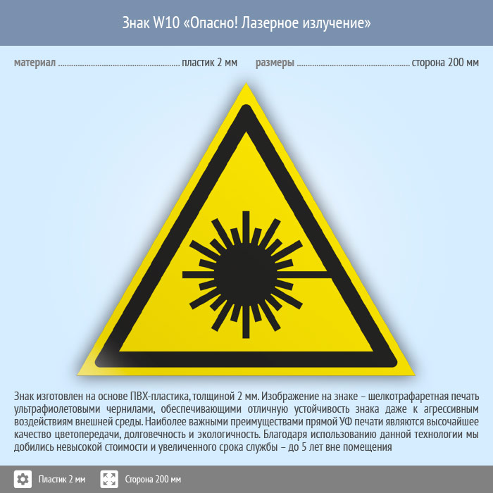 Знак W10 «Опасно! лазерное излучение» (пластик, сторона 200 мм) в Великом Новгороде купить