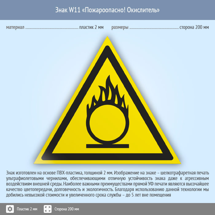 Знак W11 «Пожароопасно! окислитель» (пластик, сторона 200 мм) в Великом Новгороде купить
