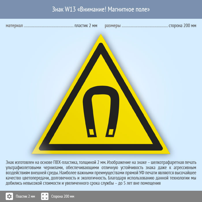 Знак W13 «Внимание! магнитное поле» (пластик, сторона 200 мм) в Великом Новгороде купить