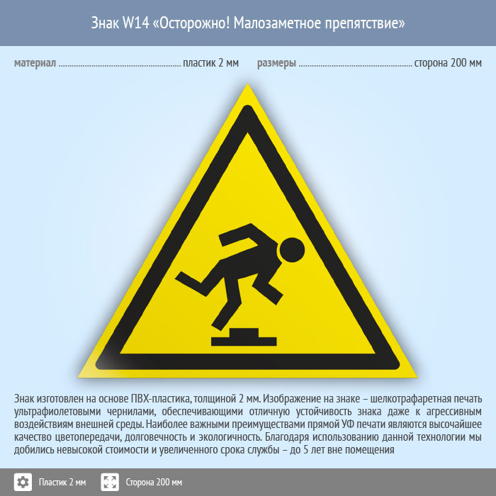 Знак W14 «Осторожно! малозаметное препятствие» (пластик, сторона 200 мм) в Великом Новгороде купить