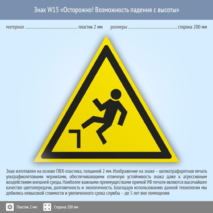 Знак W15 «Осторожно! возможность падения с высоты» (пластик, сторона 200 мм) в Великом Новгороде купить