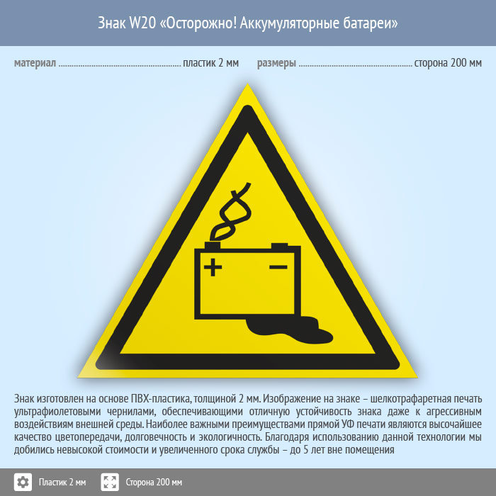 Знак W20 «Осторожно! аккумуляторные батареи» (пластик, сторона 200 мм) в Великом Новгороде купить
