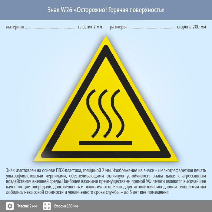 Знак W26 «Осторожно! горячая поверхность» (пластик, сторона 200 мм) в Великом Новгороде купить