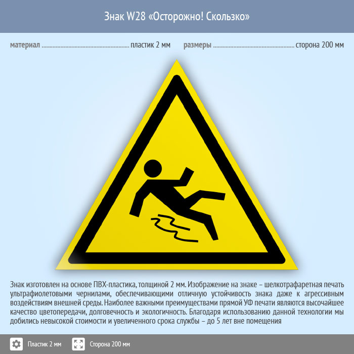 Знак W28 «Осторожно! скользко» (пластик, сторона 200 мм) в Великом Новгороде купить