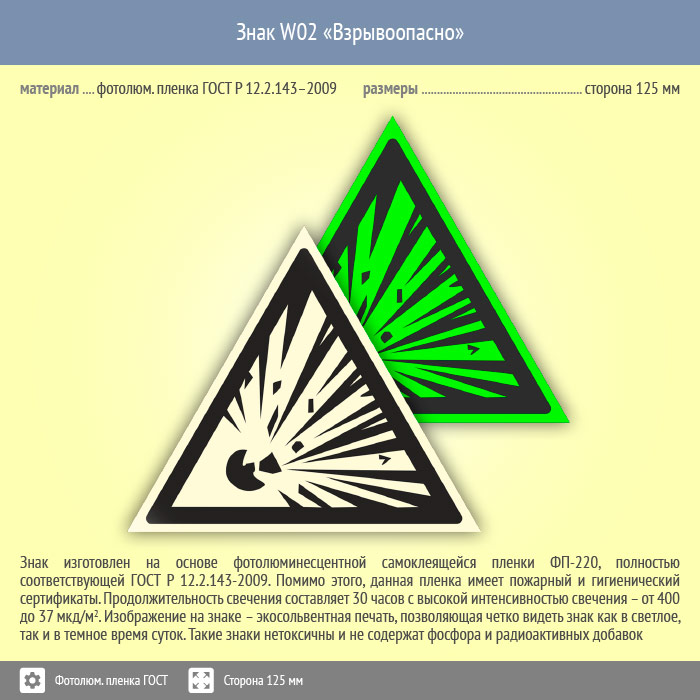 Знак W02 «Взрывоопасно» (фотолюминесцентная пленка ГОСТ 34428-2018, сторона 125 мм) в Великом Новгороде купить
