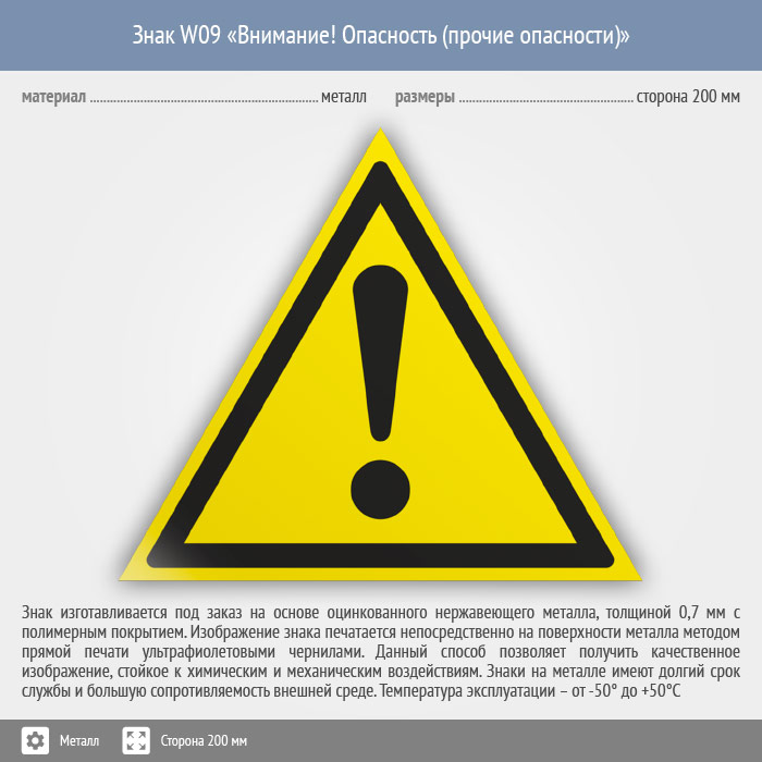 Знак W09 «Внимание! опасность (прочие опасности)» (металл, сторона 200 мм) в Великом Новгороде купить