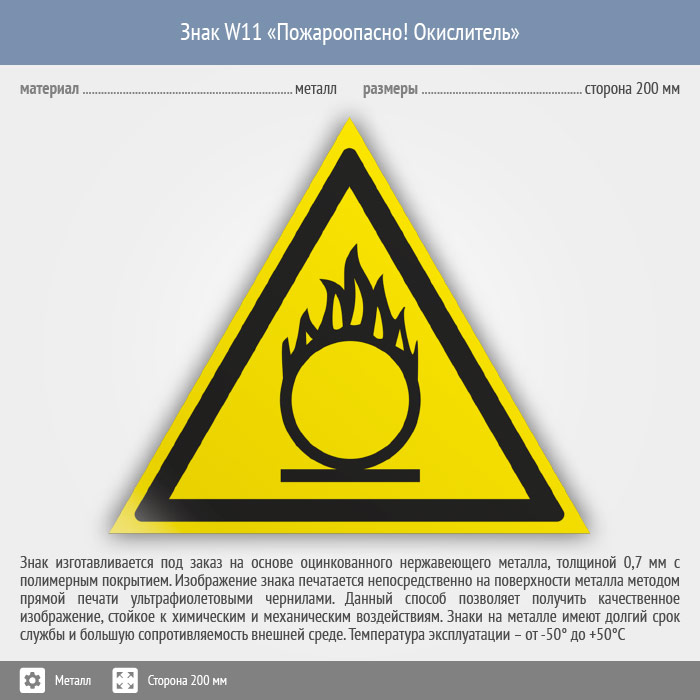 Знак W11 «Пожароопасно! окислитель» (металл, сторона 200 мм) в Великом Новгороде купить