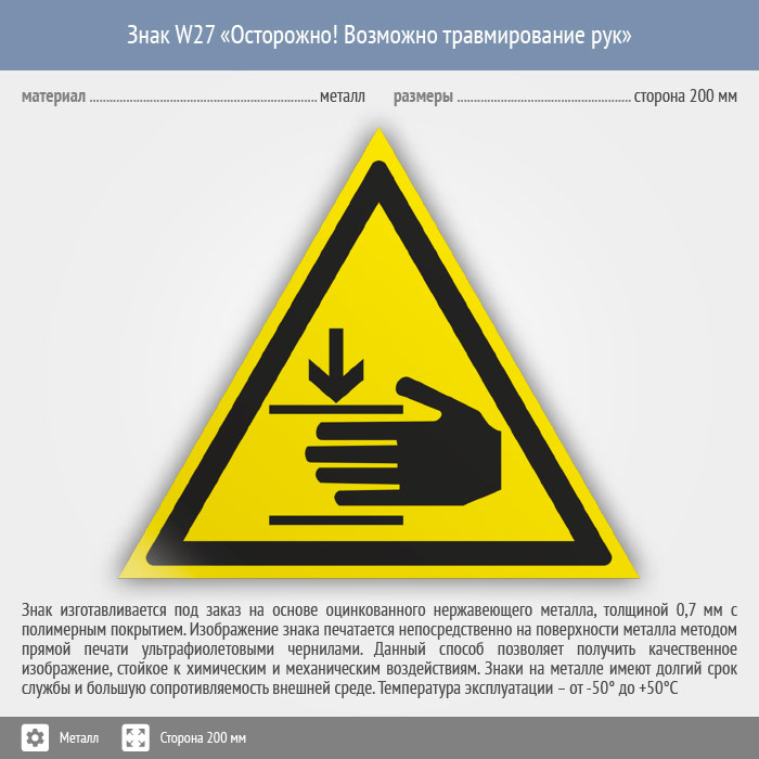 Знак W27 «Осторожно! возможно травмирование рук» (металл, сторона 200 мм) в Великом Новгороде купить